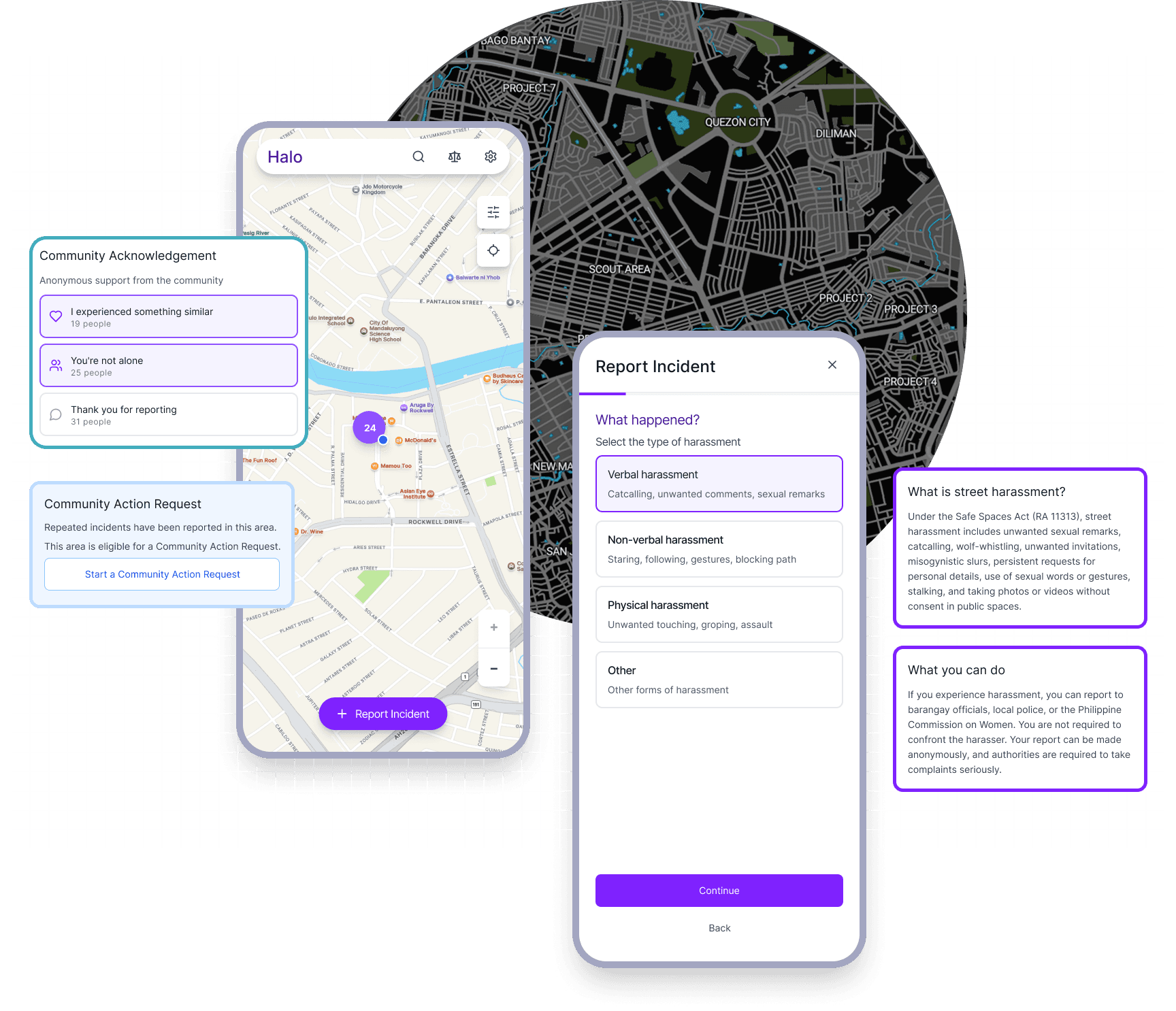 Halo is a mobile app concept designed to surface patterns of street harassment in Metro Manila. Rather than positioning itself as a safety or navigation tool, Halo reframes harassment reporting as a civic visibility problem, one that can be addressed through aggregated data, community validation, and structured requests for systemic change.