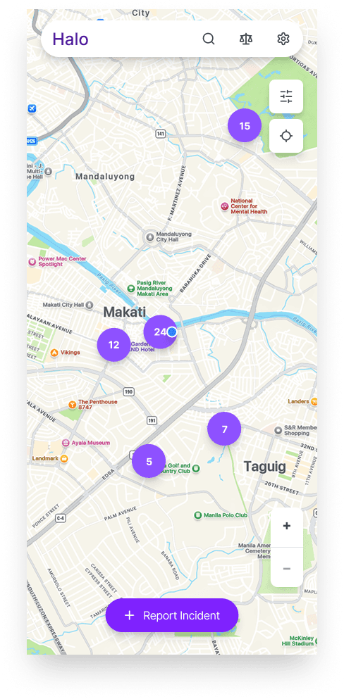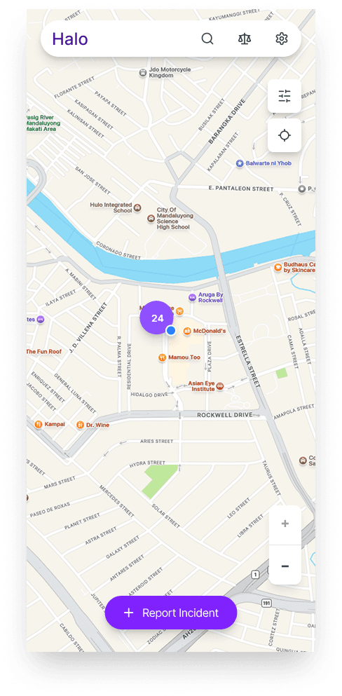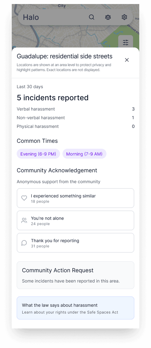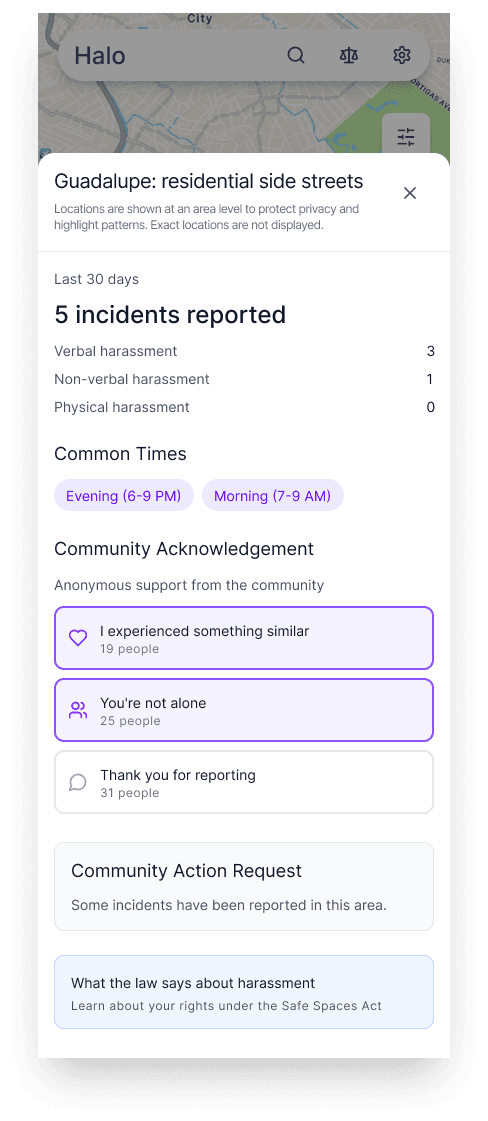 The map is Halo’s central interface. It displays aggregated incident markers across Metro Manila, helping users understand where patterns recur, not where danger exists. I want to avoid fossilizing areas or implying risk guarantees. So,