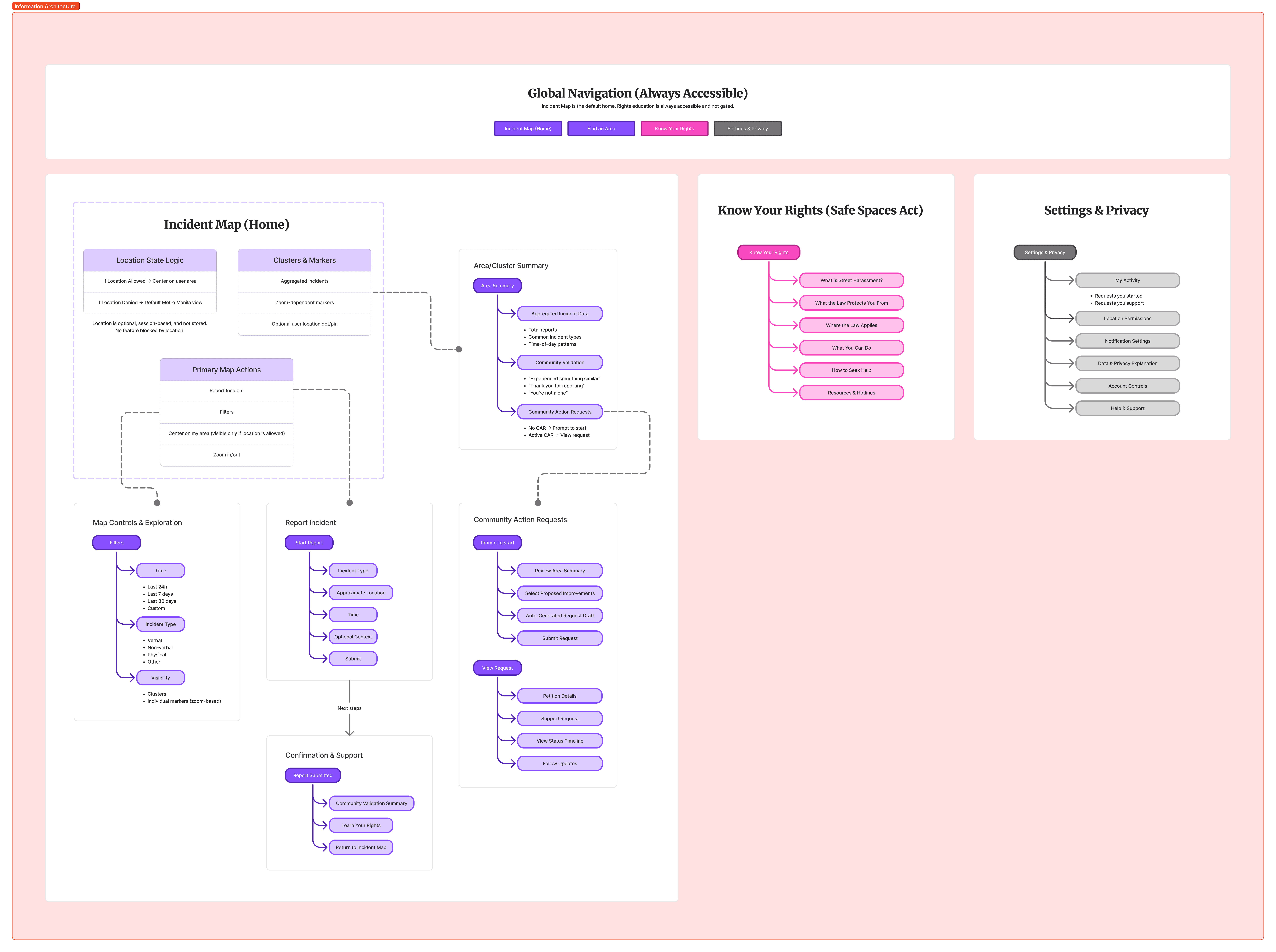 This project began as an academic exploration into how technology could support women experiencing street harassment. Early concepts included wearable-assisted reporting, evidence capture, and safety-oriented route guidance.