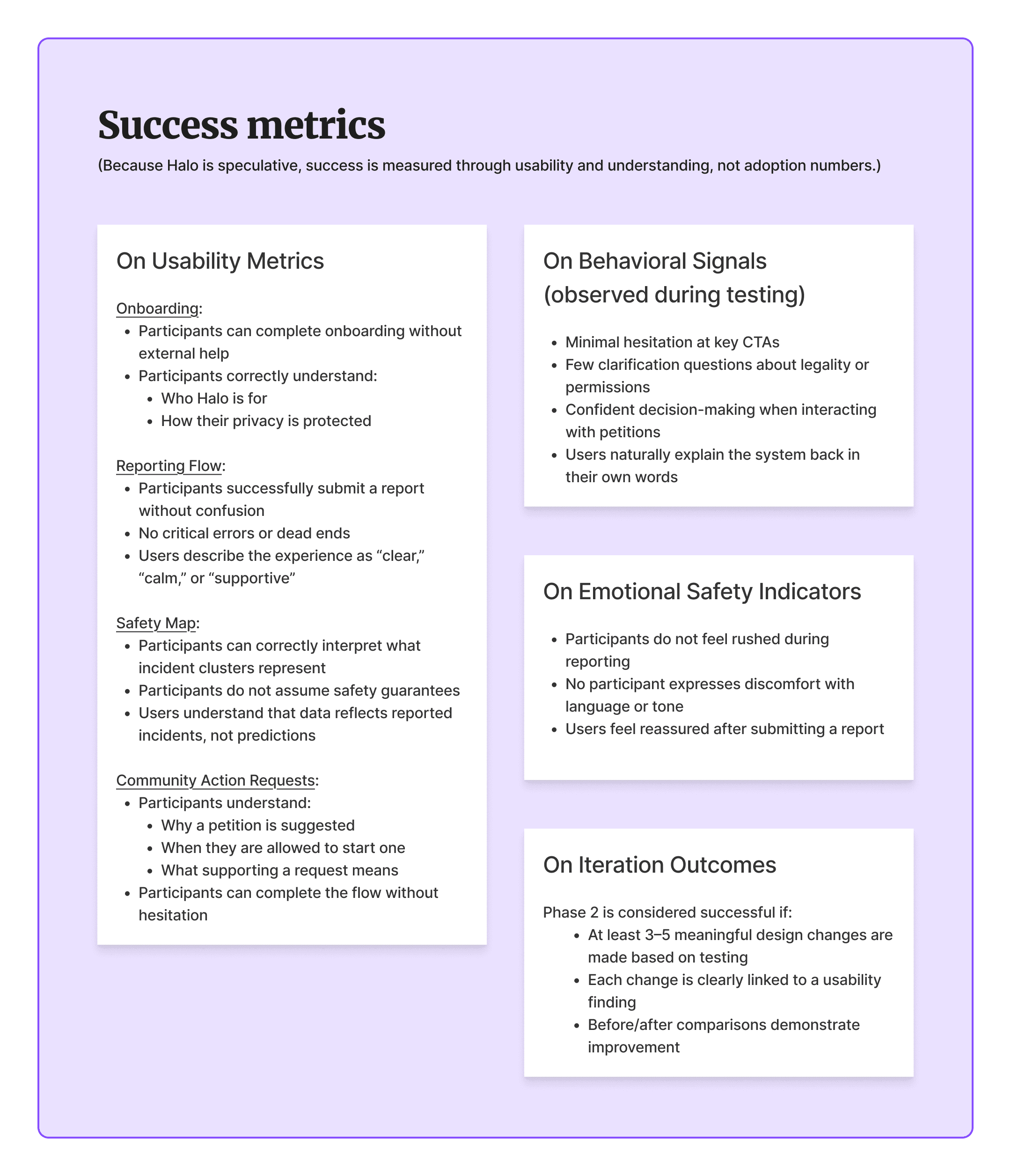 Success is measured through user understanding, confidence, and emotional comfort, not adoption or engagement metrics. Insights from testing will inform further iteration, particularly around copy clarity and flow sequencing.