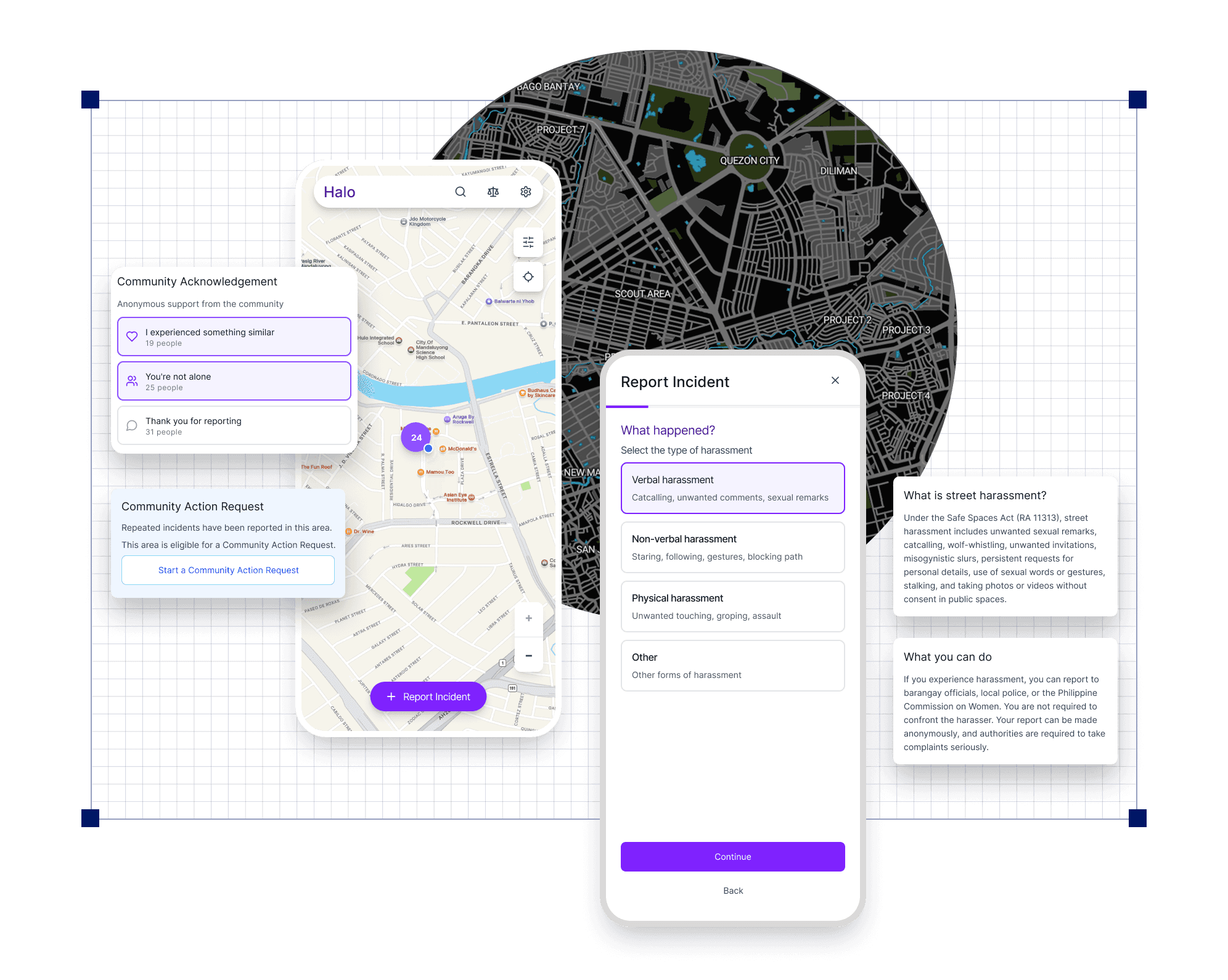 Halo is a mobile app concept that looks at street harassment as a shared, civic issue rather than an individual safety problem. Instead of offering safety guarantees or navigation, Halo focuses on making patterns of harassment visible through aggregated reports, community validation, and structured requests for systemic change.