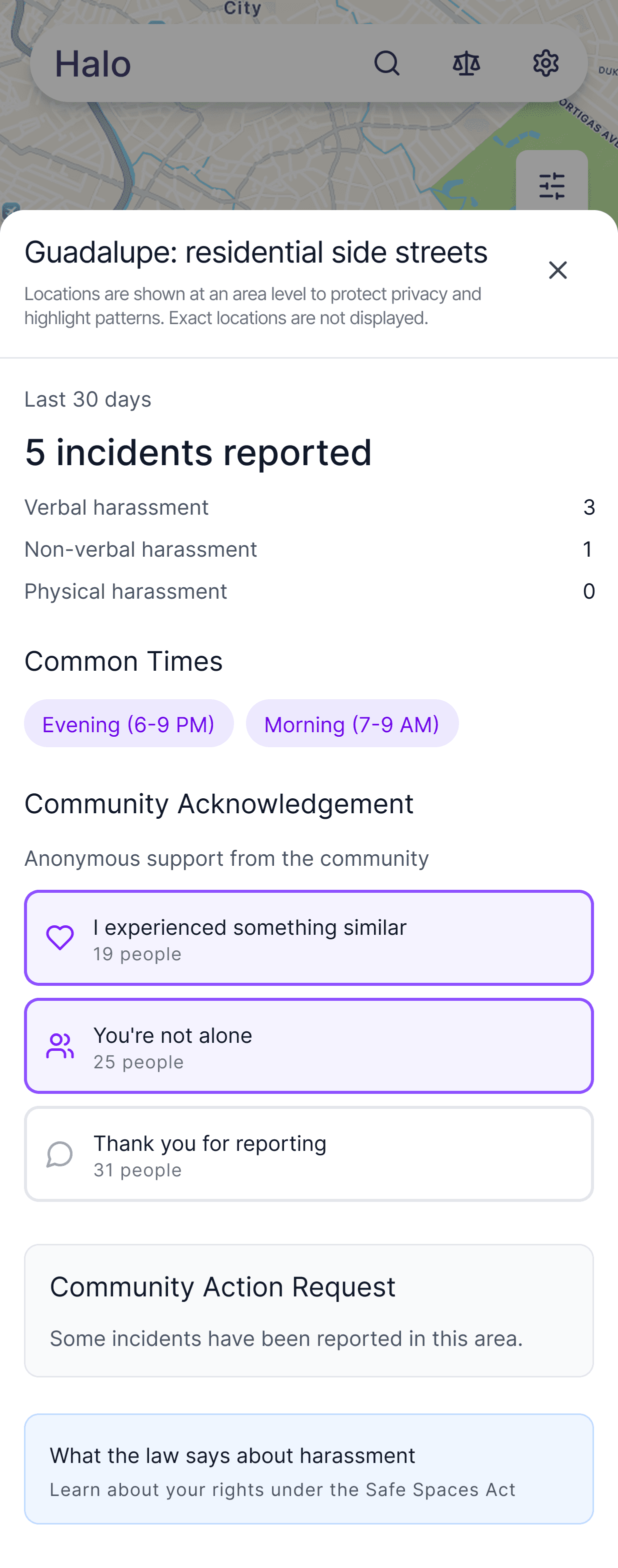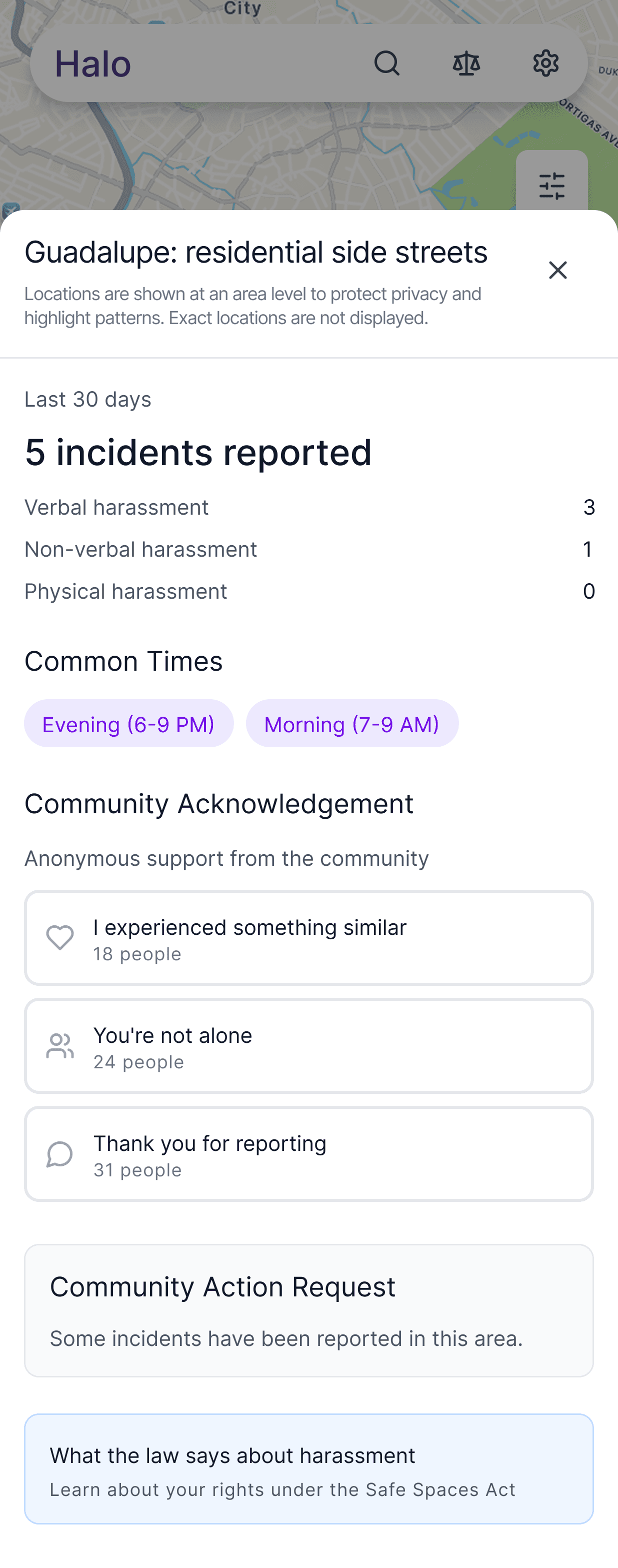When patterns recur, Halo enables Community Action Requests that shift the response from individual risk management to collective, place-based action.