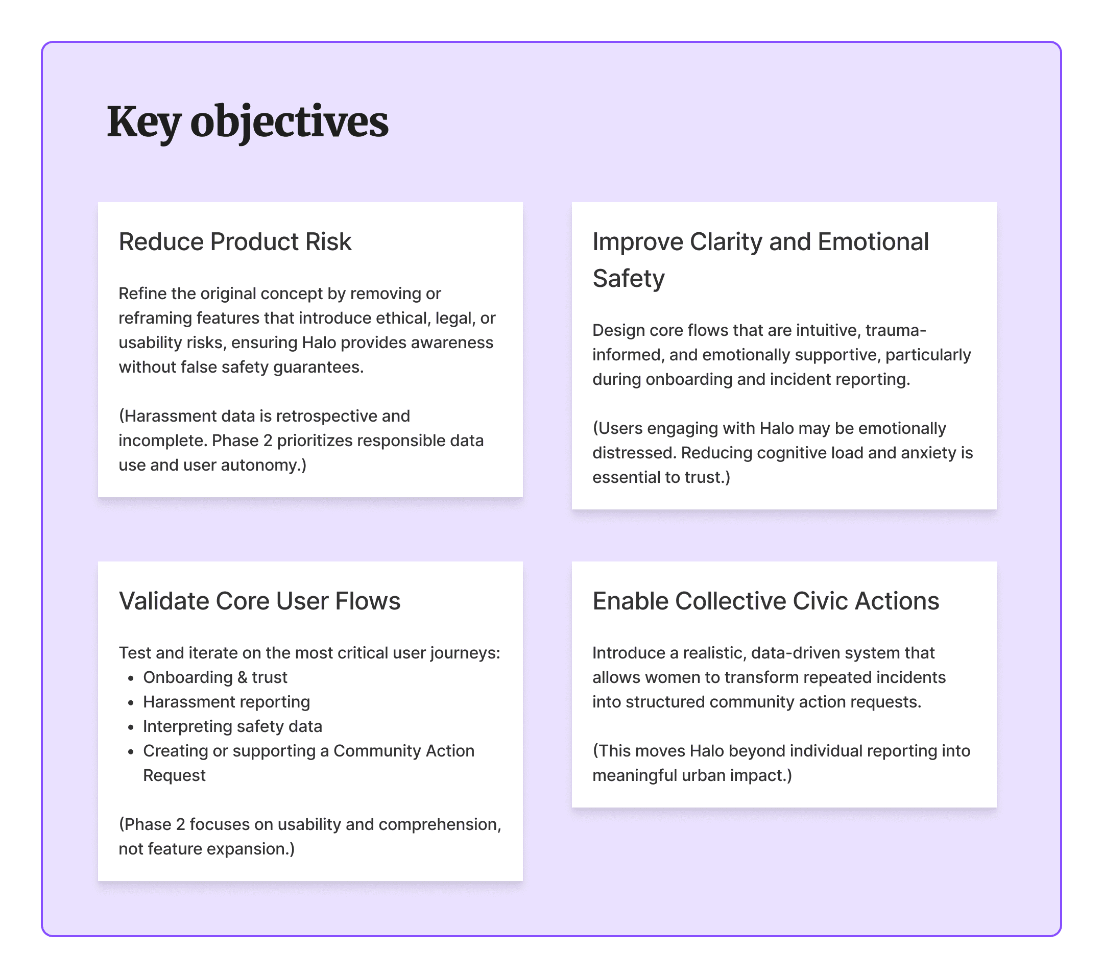 Rather than adding new functionality, I focused on restraint-driven design, where removing features was often more important than introducing them. The goal was to transition Halo from a speculative academic concept into a credible, testable product experience, while prioritizing ethical clarity and emotional safety. My four key priorities are to: