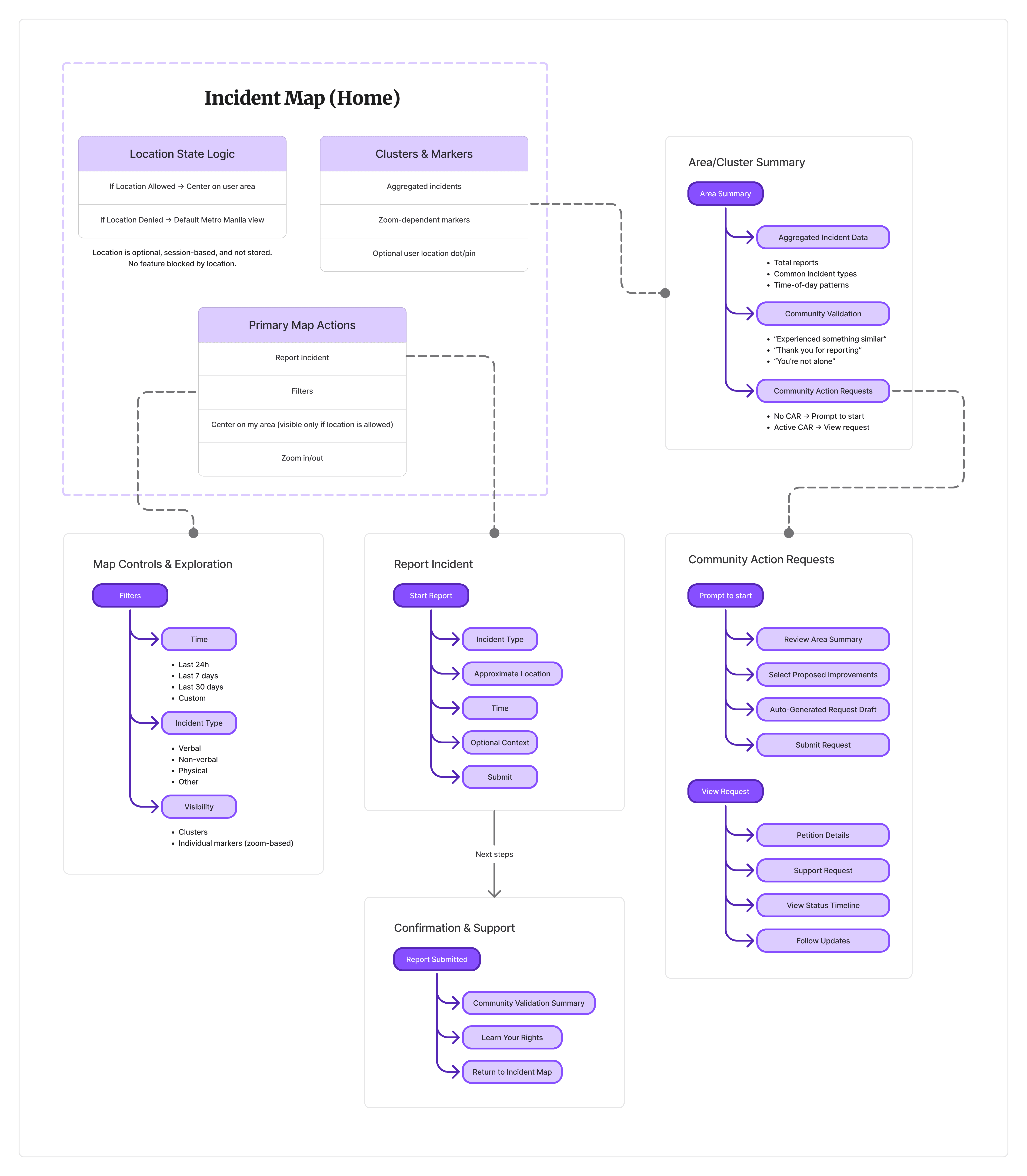 The Incident Map serves as the primary entry point, supported by clear paths to reporting, area summaries, Community Action Requests, and legal education. Educational content and privacy controls are treated as core features, not secondary ones, ensuring users can understand their rights and the system itself at any point.