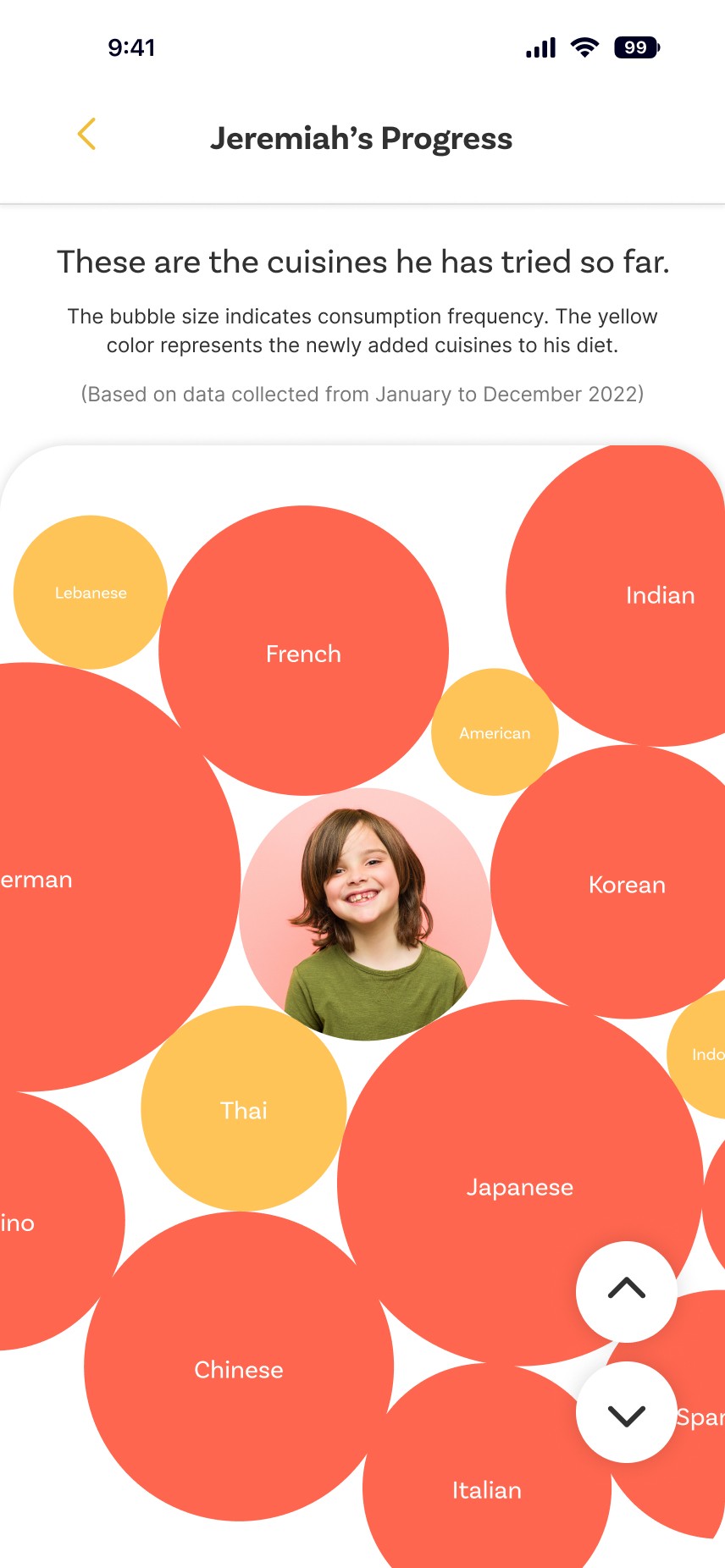 The Child Progress section visualizes this journey through a cuisine diversity chart. Each bubble represents a cuisine the child has experienced, while the size of the bubble reflects how often that cuisine appears in their meals.