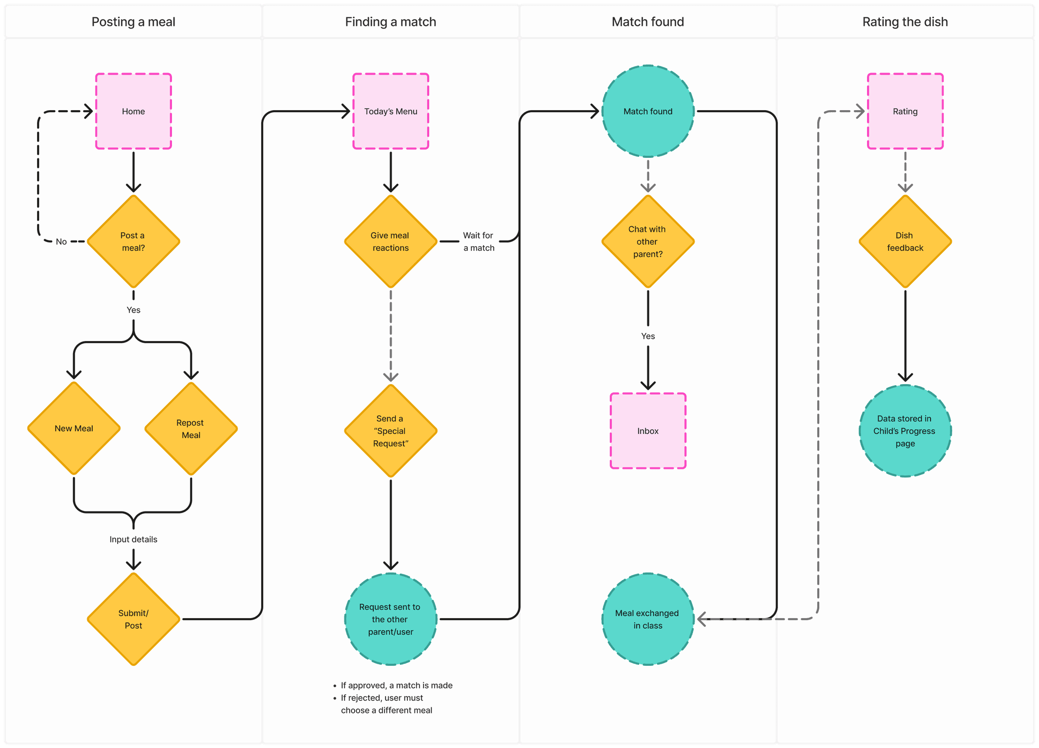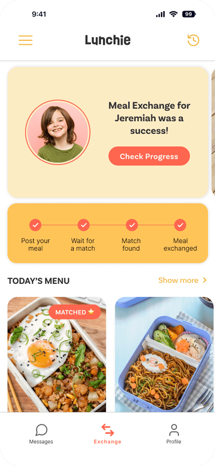 Inspired by the simplicity of matching apps, parents can browse available meals and select exchanges for their child.