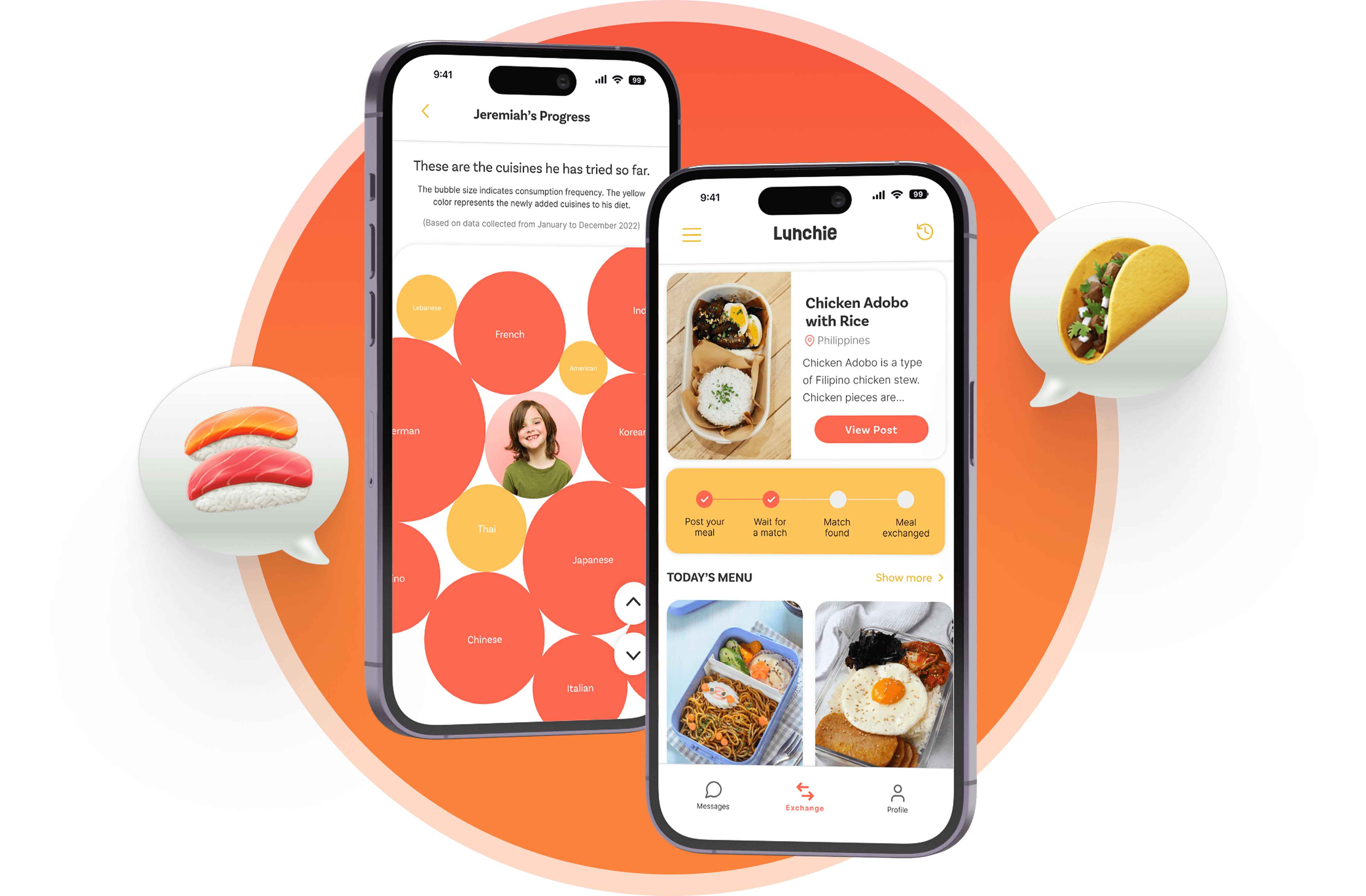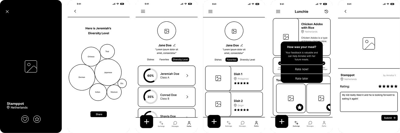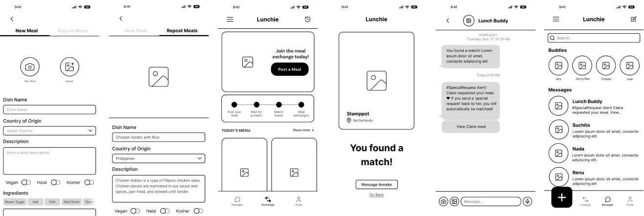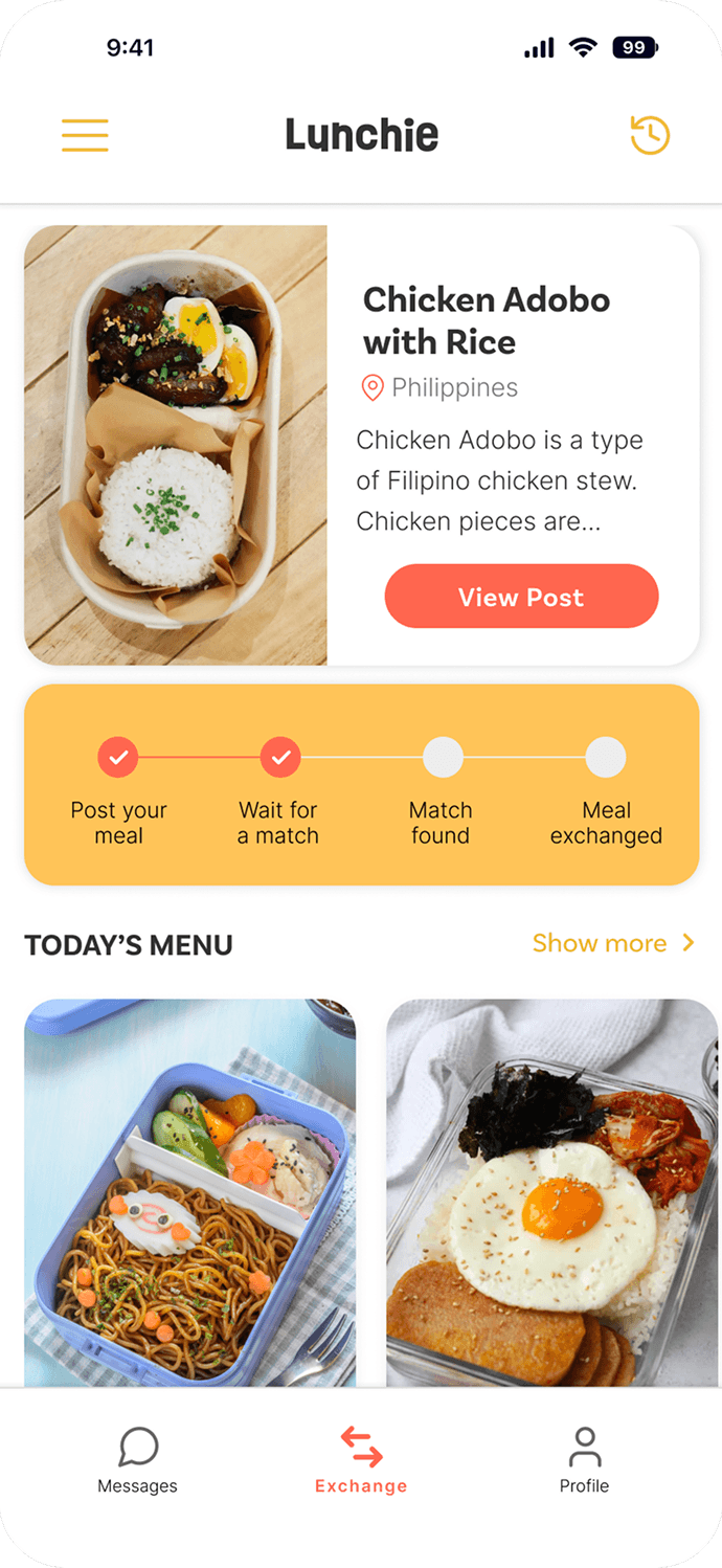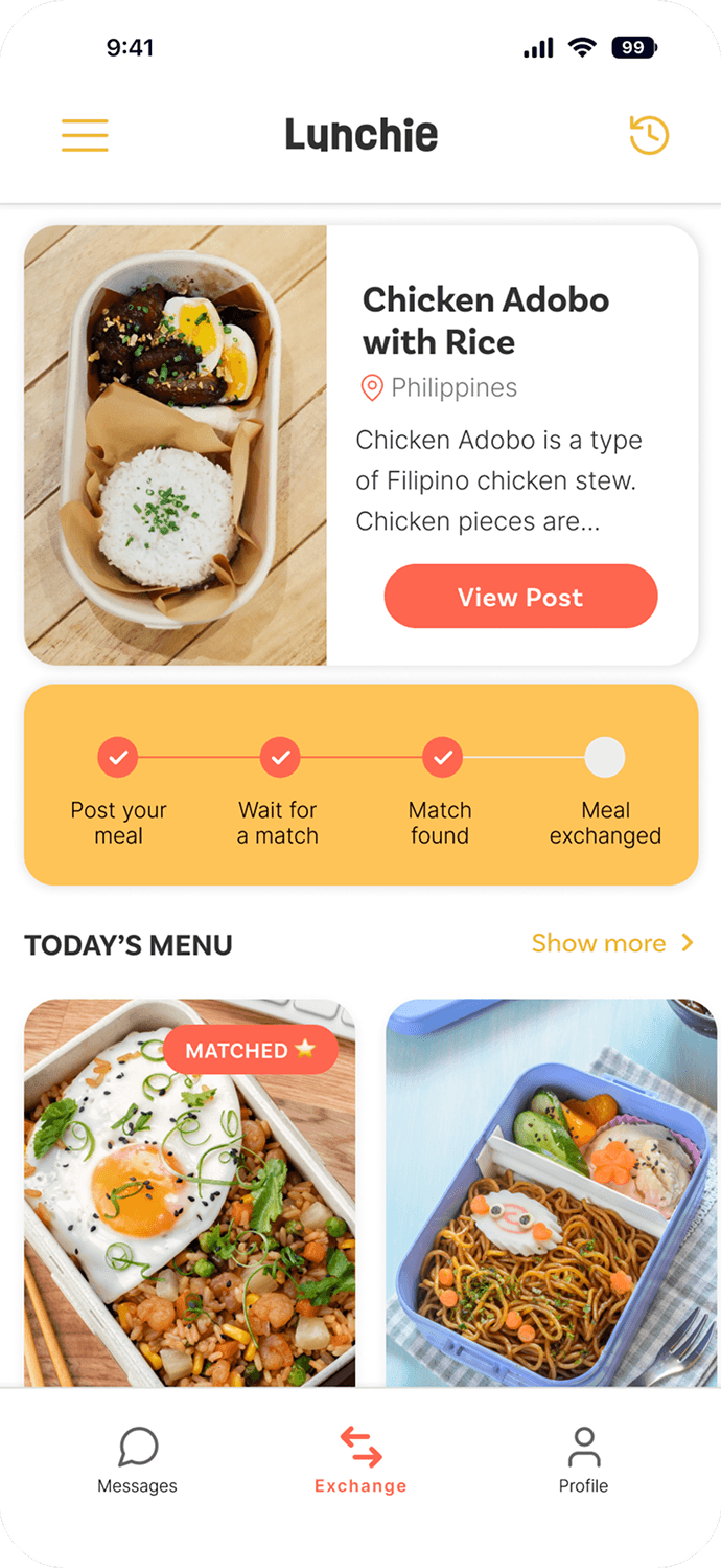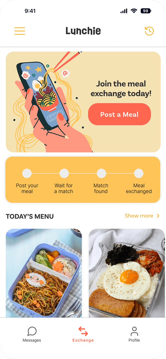 Lunchie was designed to support the full lifecycle of a meal exchange, from posting a meal to tracking a child’s food journey over time.